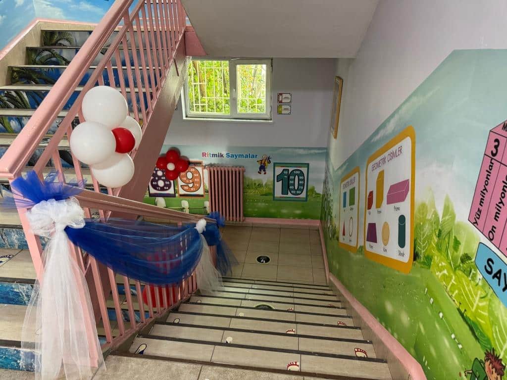 2025-2026 EĞİTİM ÖĞRETİM YILI HAZIRLIKLARI KAPSAMINDA OKULUMUZUN BAHÇE KAPISI DIŞARI İLE İRTİBATIN KESİLEBİLMESİ VE OKULUMUZUN GÖRÜNÜRLÜĞÜNÜN ARTTIRILMASI İÇİN OKUL İSMİMİZİN YAZILI OLDUĞU MATERYALLE KAPLANDI. OKUL GİRİŞİNDE BULUNAN VE ÖĞRENCİLERİN YAĞMURDA ISLANMASINI ÖNLEMEK İÇİN YAPILAN ÇATININ ALTI GÖKYÜZÜ TEMASI İLE KAPLANARAK KARANLIK GÖRÜNTÜNÜN ÖNÜNE GEÇİLDİ. OKUL BAHÇEMİZDEKİ TOPRAK ALANLAR ELDEN GEÇİRİLEREK ÇİMLE KAPLANDI. OKULUMUZUN TÜM AYDINLATMA ÜNİTELERİ 60X60 LED ARMATÜRLERLE DEĞİŞTİRİLEREK SINIFLARIN VE TÜM İÇ MEKANLARIN DAHA AYDINLIK OLMASI SAĞLANDI.OKUL GİRİŞİNDEKİ SPOTLAR ELDEN GEÇİRİLEREK YANMAYANLAR DEĞİŞTİRİLDİ. OKUL MERDİVEN DUVARLARI ÖĞRENCİLERİN FAYDALANACAĞI GÖRSELLERLE SÜSLENEREK GÜZEL GÖRÜNTÜLER OLUŞTURULDU.