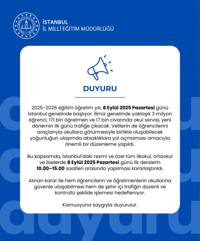 İSTANBUL VALİLİĞİN ALMIŞ OLDUĞU KARAR GEREĞİNCE 8 EYLÜL PAZARTESİ GÜNÜ OKULLARIN TÜM KADEMELERDE AÇILACAK OLMASI NEDENİYLE YAŞANABİLECEK TRAFİK KARMAŞASININ ÖNÜNE GEÇMEK İÇİN SADECE 8 EYLÜL GÜNÜ DERSLER SAAT 10:00'DA BAŞLAYIP 15:00'DA SONA ERECEKTİR. TÜM VELİLERİMİZİN BİLGİSİNE....